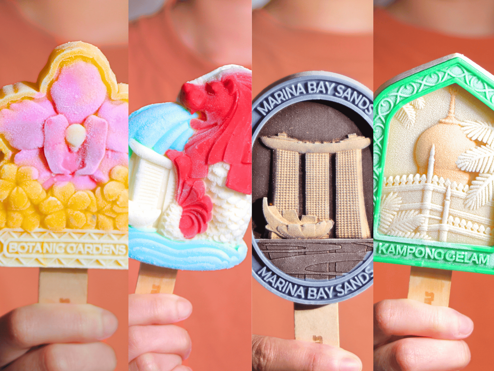 Momolato popsicles in the shape of Singapore’s iconic landmarks in this order: Orchid from Botanic Gardens, Merlion, Marina Bay Sands building, and Sultan Mosque at Kampong Gelam.